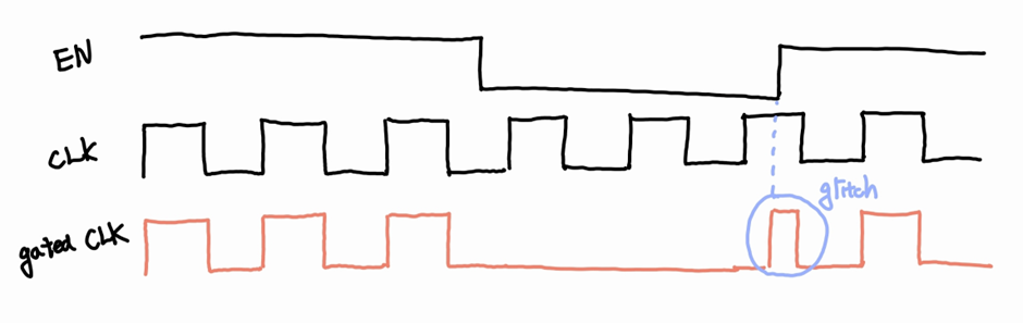 Gating Clock이 바로 High가 되어 버려 clear 하지 못한 Clock 신호가 만들어집니다.