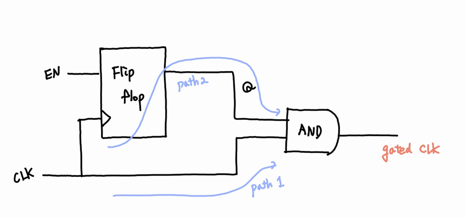 이때, Enable의 Low 값이 AND gate에 도달하는 시간이 (Path2) Clock이 AND gate에 도달하는 시간 (Path1)보다 오래 걸립니다.