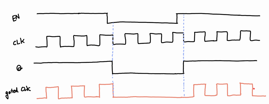 정리하자면 Enable 신호는 Clock이 Low일 때 Latch를 통과하여 AND로 전달되며, AND에서는 Enable 신호의 값에 따라 Clock을 모듈로 공급할 것인지 말 것인지 결정하게 됩니다.